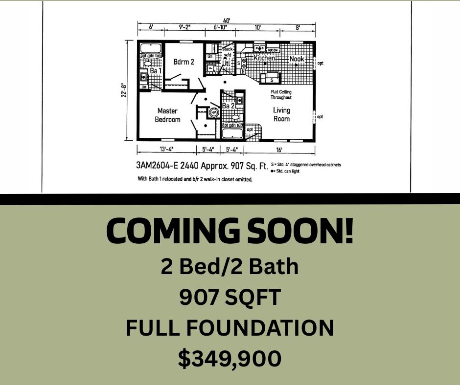 907 Sq. Ft, 2 bed, 2 bath, full foundation